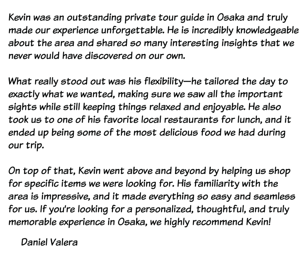 Request Your Tour Please fill out the form below and I will contact you ASAP to confirm whether your chosen day is available. If you have secondary choices for days you could join a tour, please enter them in Special Requests. Your name Your email Tour you wish to book —Please choose an option—Osaka Van TourOsaka Walking & Public Transportation TourKyoto Van TourHistoric Kyoto Walking TourNara Van TourCountryside/Hiking TourRecord Stores Tour Date you wish to book Number of adults Number of children under 12 Where will you be staying (where to pick you up) —Please choose an option—OsakaKyotoKobeNaraCruise Ship - Osaka PortCruise Ship - Kobe Port Recommended by Special requests Δ